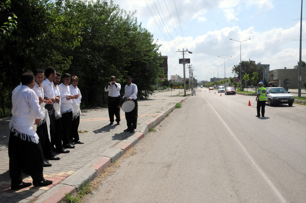 Trafik polisi Mesut Baykul, AA muhabirine yaptığı açıklamada, trafik kazalarına dikkati çekmek ve sürücüleri uyarmak amacıyla, kontrolleri davullu zurnalı yaptıklarını söyledi.
