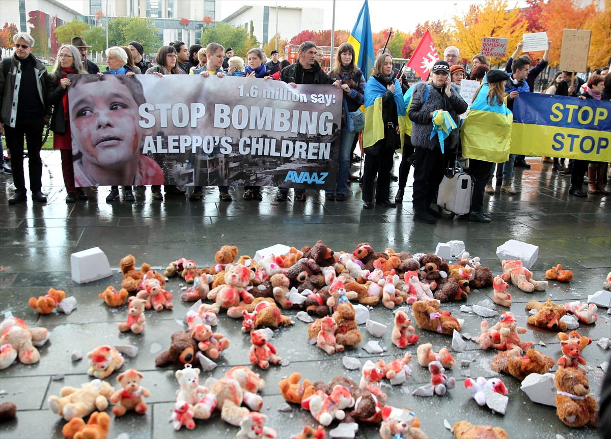 Göstericiler, Suriye ve Ukrayna bayraklarının yanı sıra üzerinde “Suriye barış sadece bombalamadan olur”, “Rusya Suriye’yi bombalamayı durdur” ve “Halep yanıyor” yazan dövizler taşıdı.