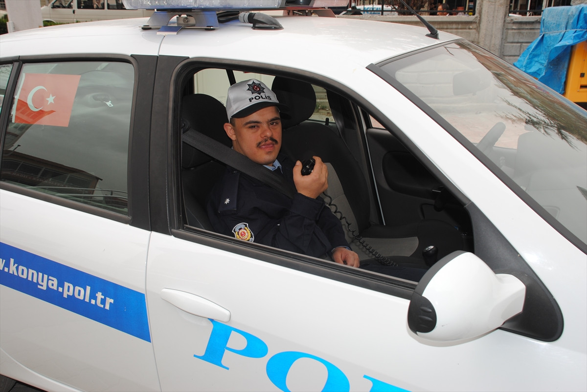 KONYA (AA) - Konya'nın Sarayönü ilçesinde yaşayan down sendromlu Gökhan Taş, hayalini kurduğu polis üniformasını giyerek trafik kontrolü yaptı.