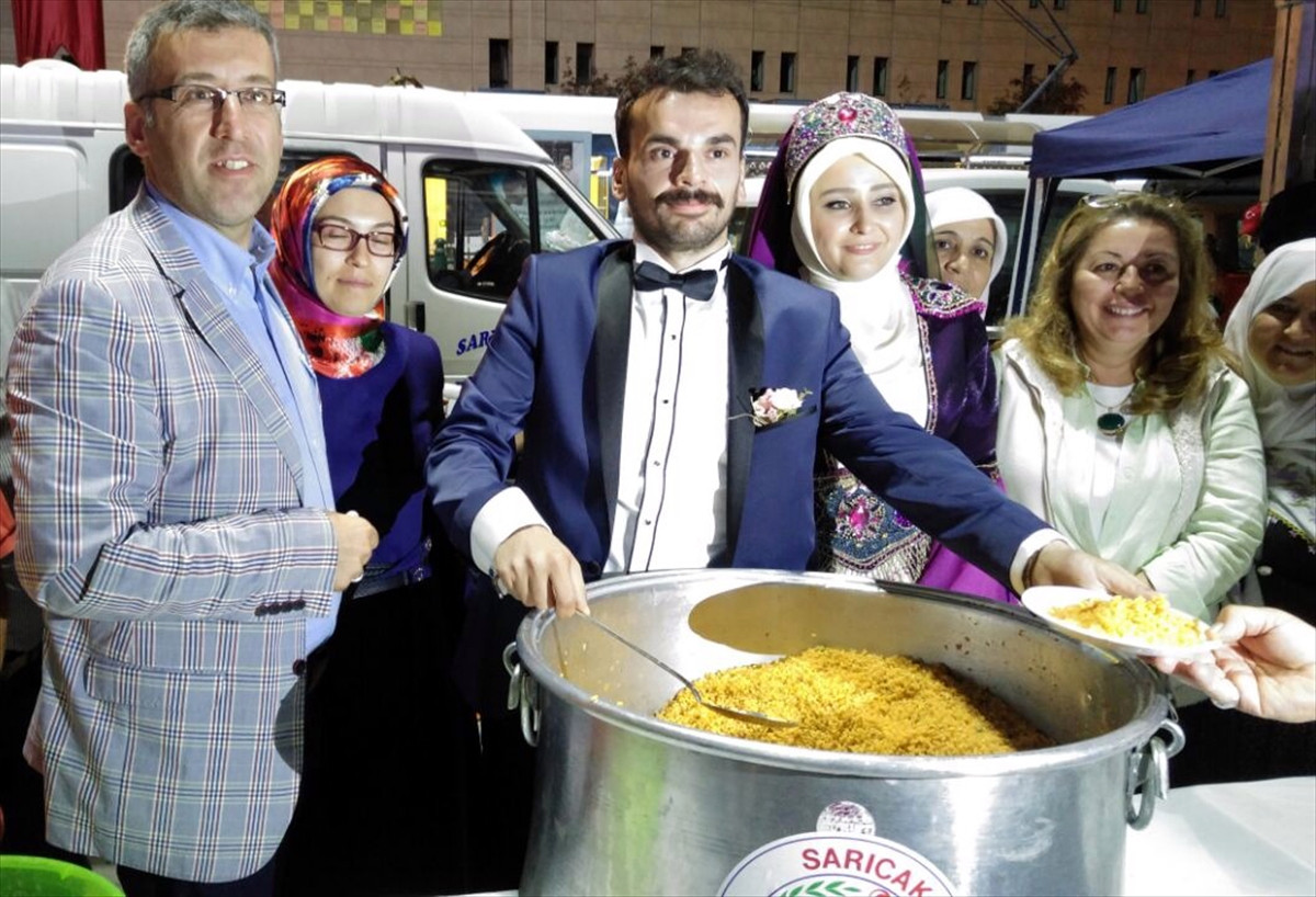 Daha sonra yeni evli çift, Sarıcakaya Belediyesi standına geçerek, demokrasi nöbeti tutan binlerce kişiye Osmanlı aşı dağıttı.