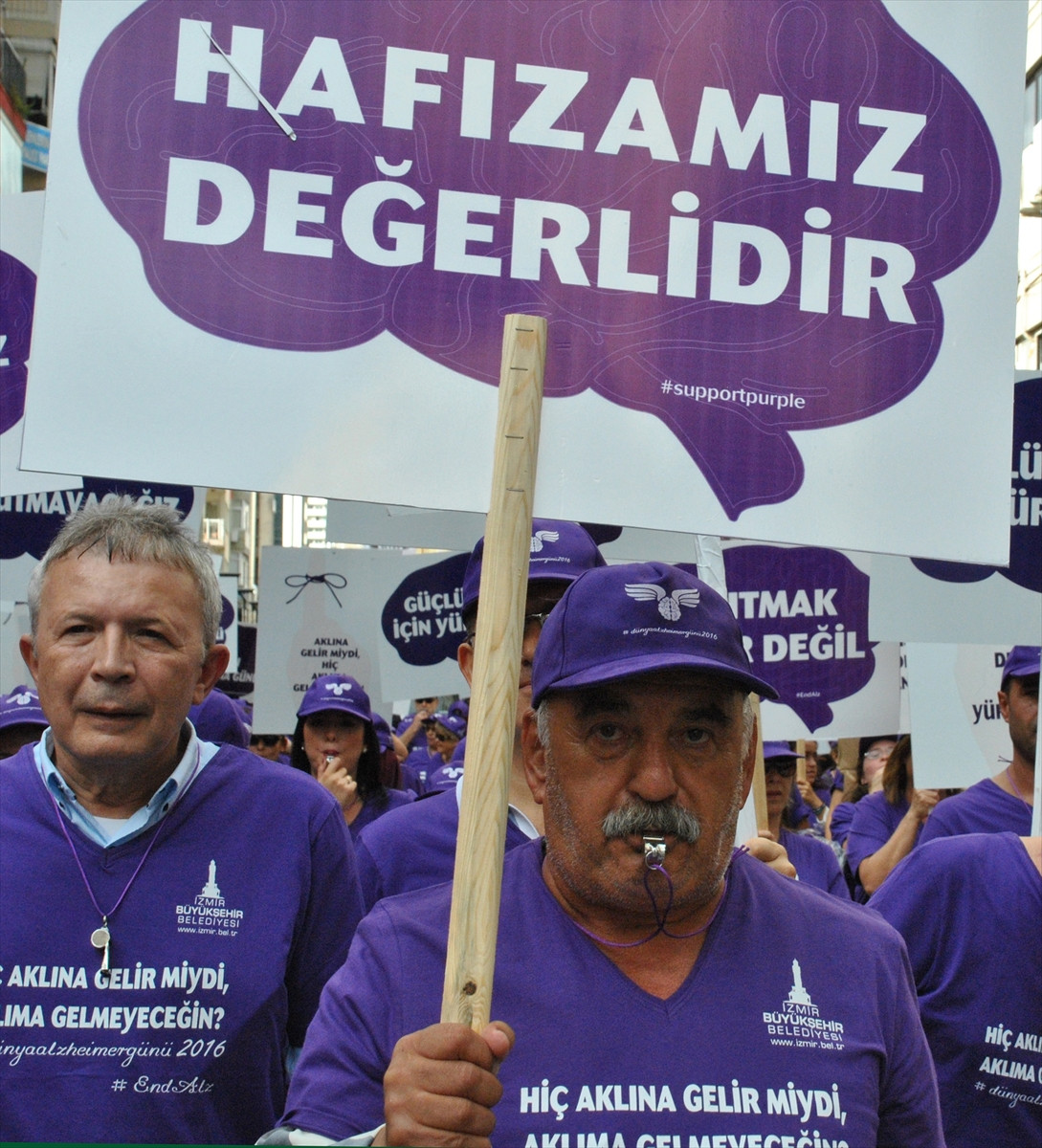 Mor tişört giyerek Kıbrıs Şehitleri Caddesi girişinde toplanan doktorlar ve alzaymır hastaları, ellerindeki pankart ve dövizlerle İzmir Büyükşehir Belediyesi Bandosu eşliğinde Talatpaşa Bulvarı'na doğru yürüdü.
