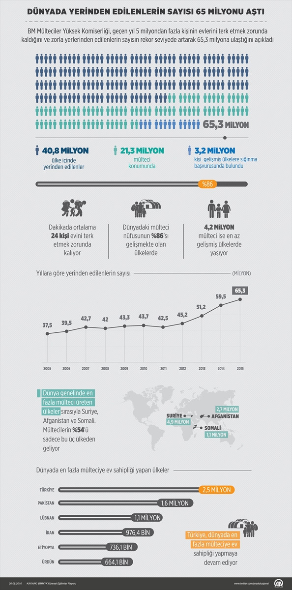 Dünya genelinde evlerini terk etmek zorunda kalan 65 milyondan fazla kişinin üçte ikisini (40,8 milyon kişi) ülke içinde yerinden edilenler oluşturuyor, 21,3 milyon kişi mülteci konumunda. 3,2 milyon kişi de gelişmiş ülkelere sığınma başvurusunda bulundu.
