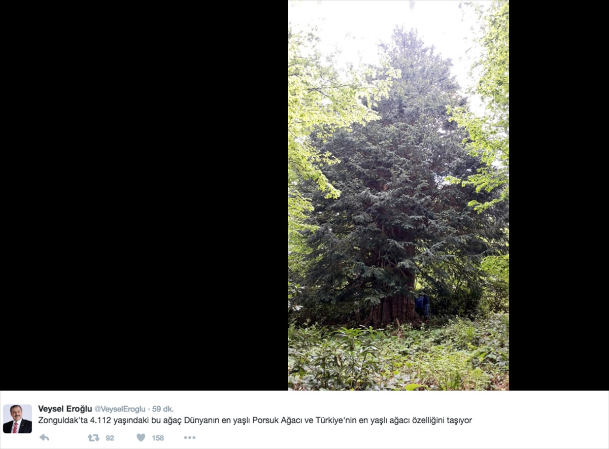 Porsuk ağacının bulunduğu bin 500 dekarlık araziyi, tabiat alanı ilan ettiklerini açıklayan Eroğlu, "Zonguldak Alaplı Gümeli'deki 4 bin 112 yaşındaki büyüleyici Porsuk Ağacı ziyaretçilerini bekliyor." ifadesini kullandı.