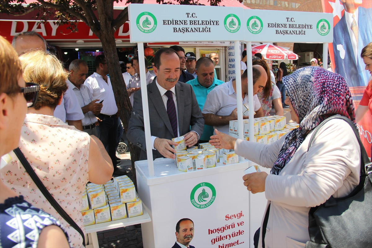 Edirne Belediye Başkanı Recep Gürkan, Saraçlar Caddesi'ndeki kurulan stantta vatandaşlara kandil simidi ikram etti.