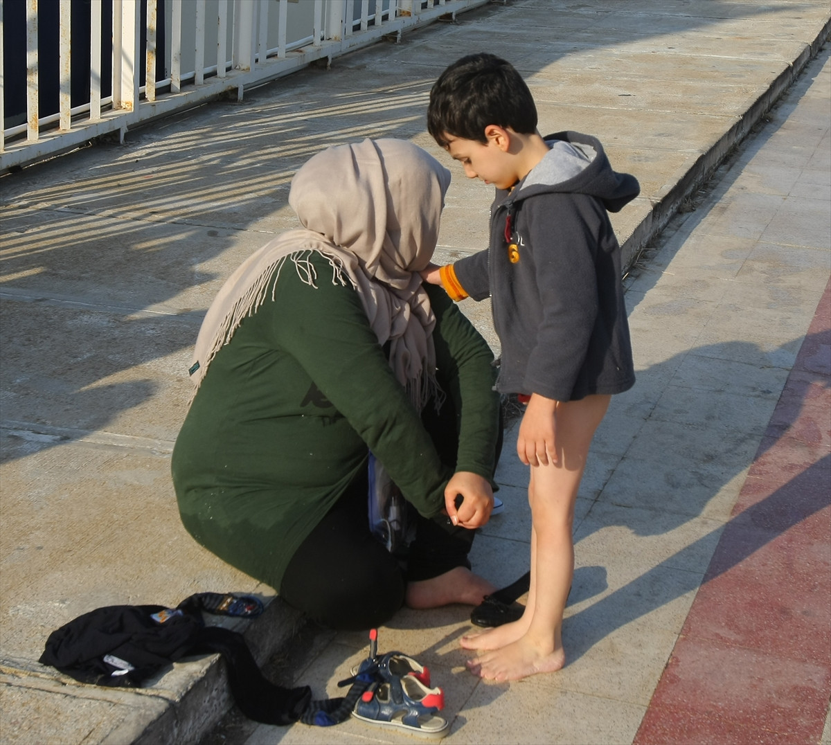 Çeşme iskelesine getirilen yabancı uyrukluların ıslanan giysilerinin yerine yenileri verildi, yiyecek ihtiyaçları karşılandı.