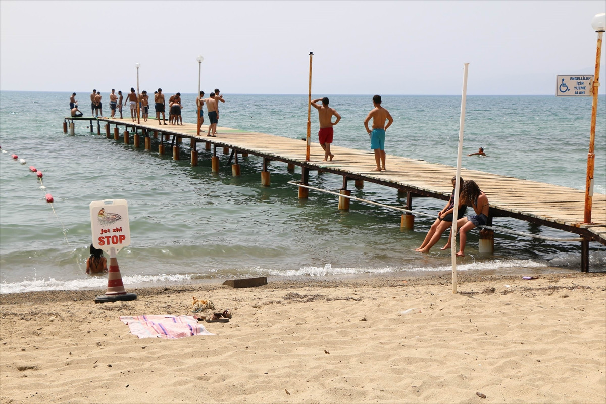 Sıcak havadan bunalanlar Burhaniye'nin Ören, Edremit’in Altınkum, Dalyan, Akçay, Güre ve Altınkum plajlarına akın etti, şemsiye ve çadır altında güneşten korunmaya çalıştı.