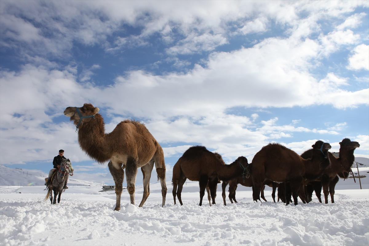 Sıcak iklim bölgelerinde yaşadığı bilinen develeri, Van'da kar üstünde gören vatandaşlar şaşkınlıklarını gizleyemiyor.