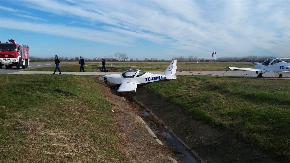 SAMSUN (AA) - Samsun'da, öğrenci pilotun kullandığı Ondokuz Mayıs Üniversitesi (OMÜ) Havacılık ve Uzay Teknolojileri Uygulama Araştırma Merkezine (UZAYTEM) ait eğitim uçağı, uçuş öncesi havaalanında kule altından pist başına giderken kontrolden çıkarak kanala girdi.
