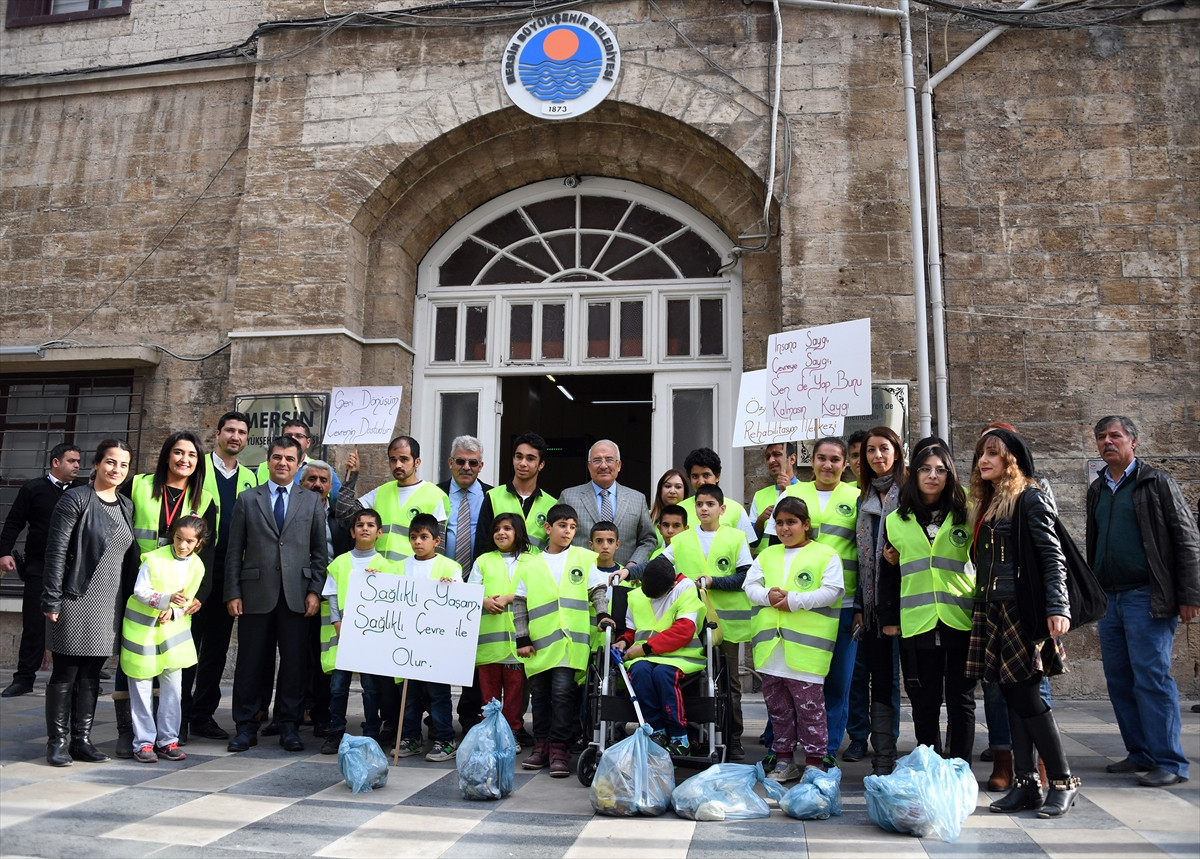 MERSİN (AA) - Mersin Büyükşehir Belediyesi tarafından hazırlanan "Temiz Bir Dünya İçin El Ele Projesi" kapsamında özel bir rehabilitasyon merkezinde eğitim alan engelli öğrenciler çevre temizliği yaptı.