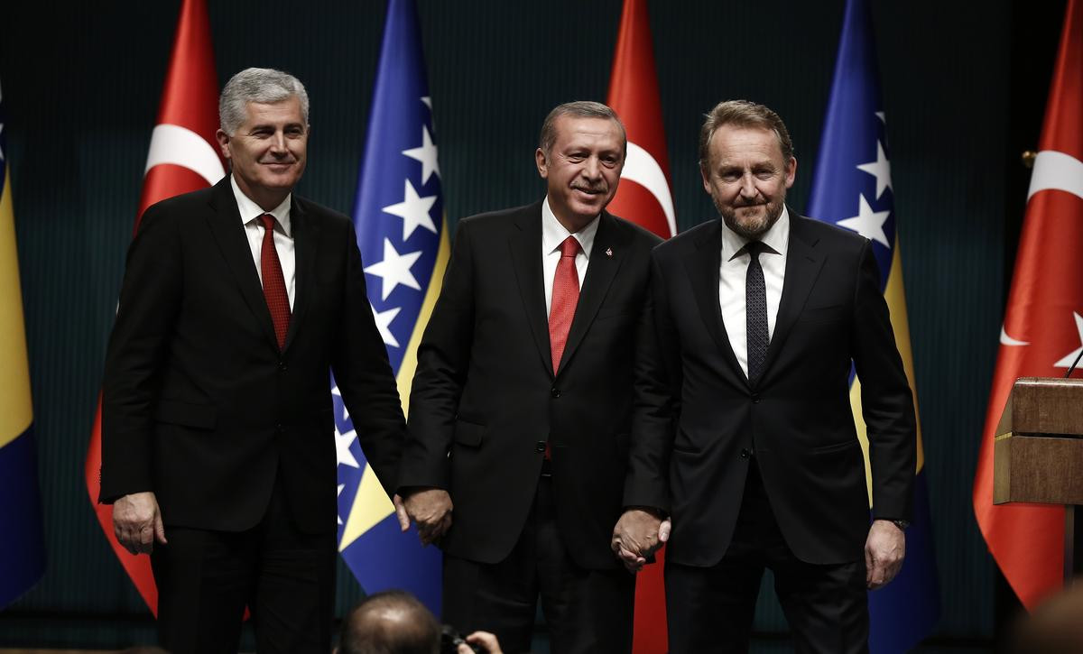Cumhurbaşkanlığı Külliyesi'nde, Erdoğan ile resmi ziyaret için Türkiye'de bulunan Bosna Hersek Cumhurbaşkanlığı Konseyi Başkanı Dragan Çoviç ve Konsey Üyesi Bakir İzzetbegoviç baş başa ve heyetler arası görüşmelerin ardından ortak basın toplantısı düzenledi ve gazetecilerin sorularını yanıtladı.