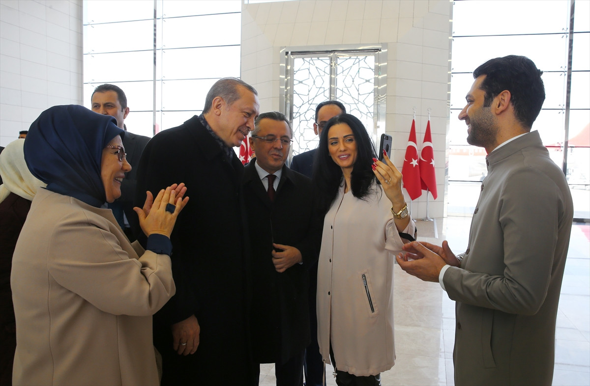 Cumhurbaşkanı Erdoğan ve eşi Emine Erdoğan, Esenboğa Havalimanı'na gelişinde oyuncu Murat Yıldırım ve nişanlısı Faslı oyuncu ve model İmane El Bani ile karşılaştı.