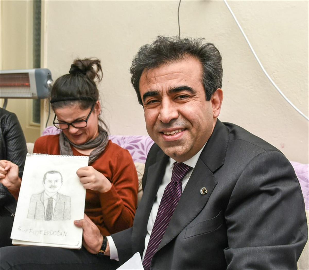 Vali Güzeloğlu'na, Gülşah Yağmur'un yaptığı Cumhurbaşkanı Erdoğan'ın portresi ile diğer çizimleri gösteren Yazıcı ailesi, ziyaretten duydukları memnuniyeti dile getirdi.