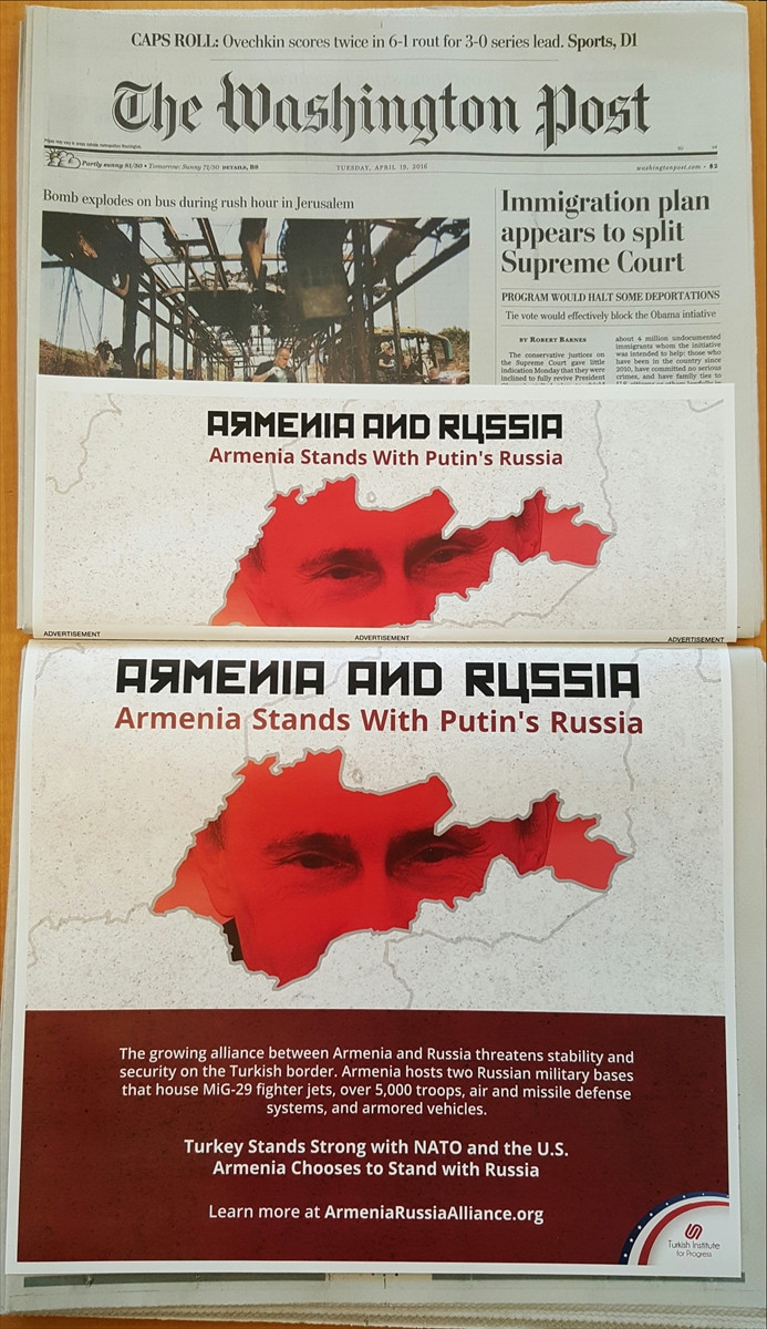 WASHINGTON (AA) - ABD'nin önde gelen gazete ve dergilerine verilen ilanlarla Ermenistan ile Rusya arasındaki ilişkiye dikkat çekildi ve iki ülkenin ittifakının Türkiye ile NATO'nun istikrarını tehlikeye soktuğu belirtildi.