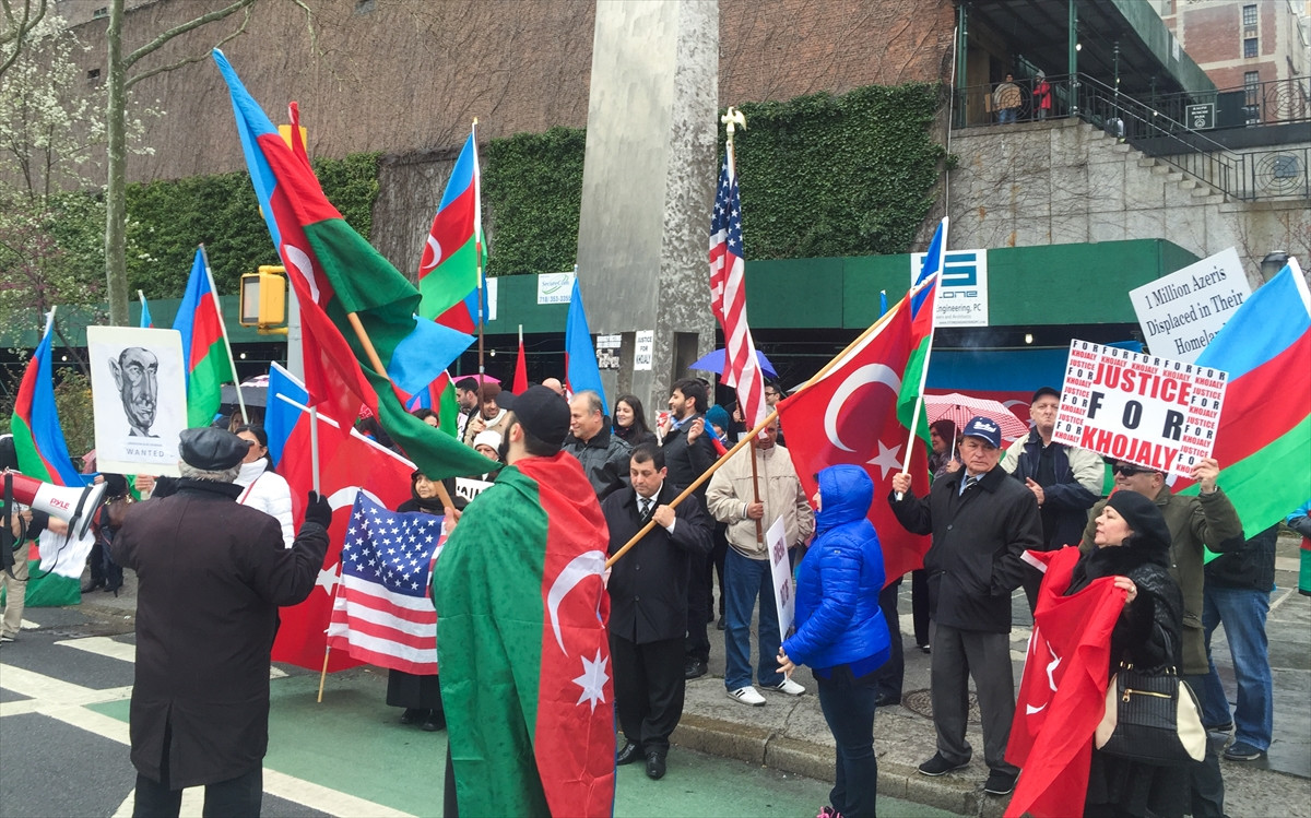 New York'taki Birleşmiş Milletler merkezi önünde düzenlenen protesto gösterisine yüzlerce Türk ve Azerbaycanlı katıldı. New York polisinin yoğun güvenlik önlemleri aldığı gösteride, bir grup Ermeni'nin engelleme girişimi güvenlik güçlerinin müdahalesiyle sonuçsuz kaldı.
