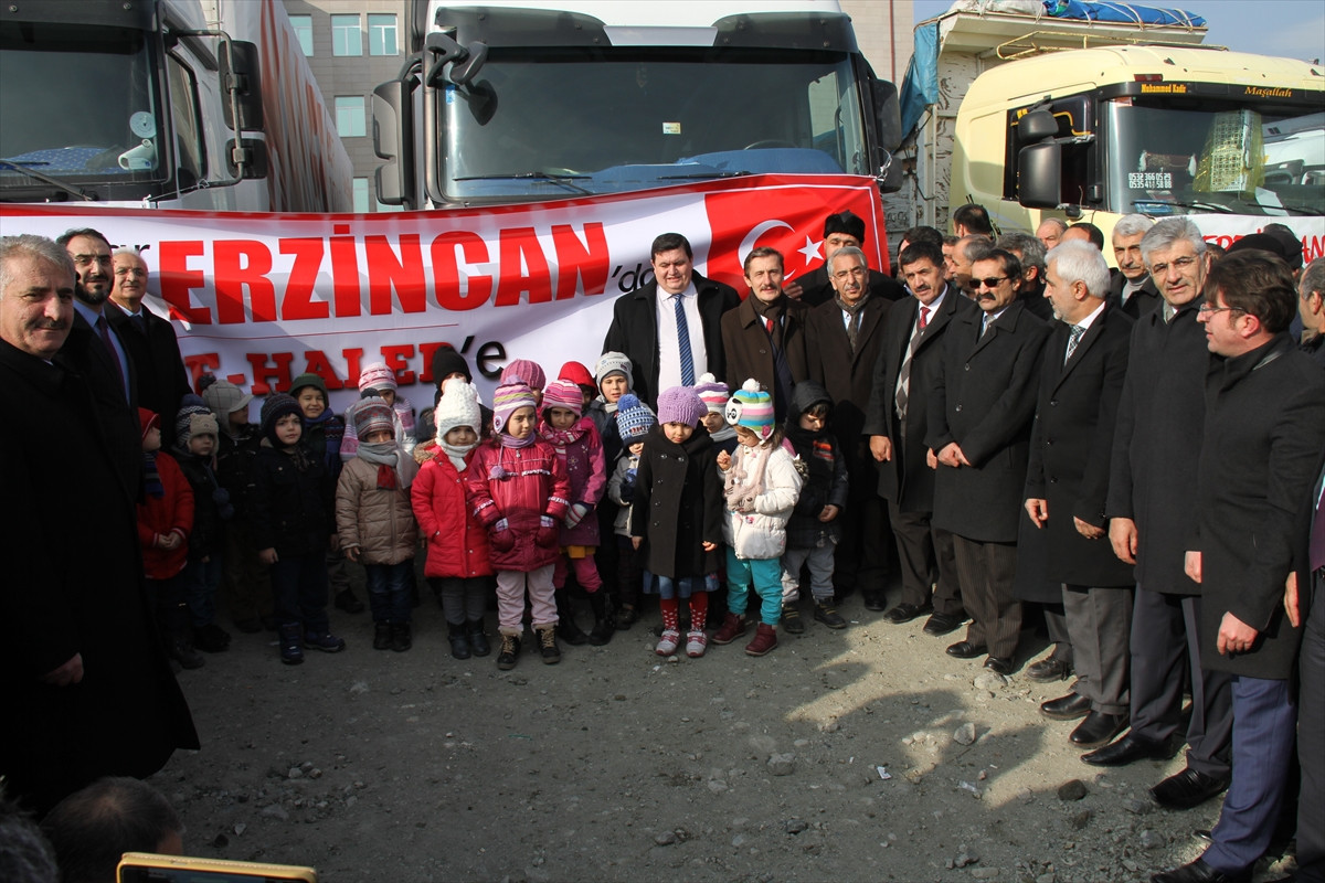Erzincan Valiliği tarafından başlatılan ve Türk Diyanet Vakfı Erzincan Şubesi tarafından koordine edilen, kentteki tüm sivil toplum kuruluşları ve resmi kurumların da destek verdiği kampanya kapsamında toplanan insani yardım malzemelerinin Suriye'ye gönderilmesi için eski otobüs terminalinde tören düzenlendi.