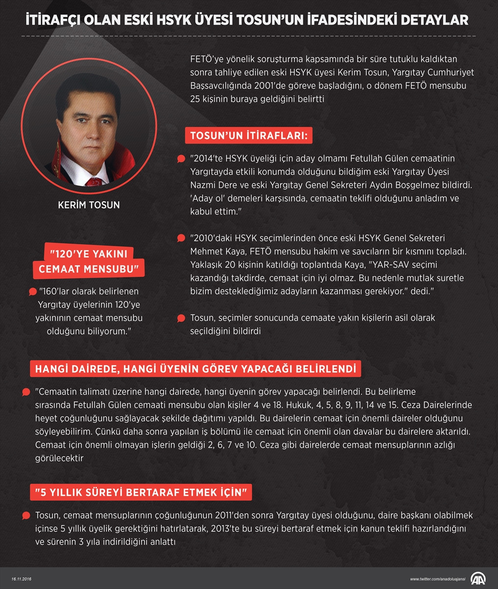 Etkin pişmanlık hükümlerinden yararlanmak isteyen Tosun, 12 Ekim 2016'daki savcılık ifadesinde, Yargıtay Cumhuriyet Başsavcılığında 2001'de göreve başladığını, o dönem FETÖ mensubu 25 kişinin buraya geldiğini belirtti.