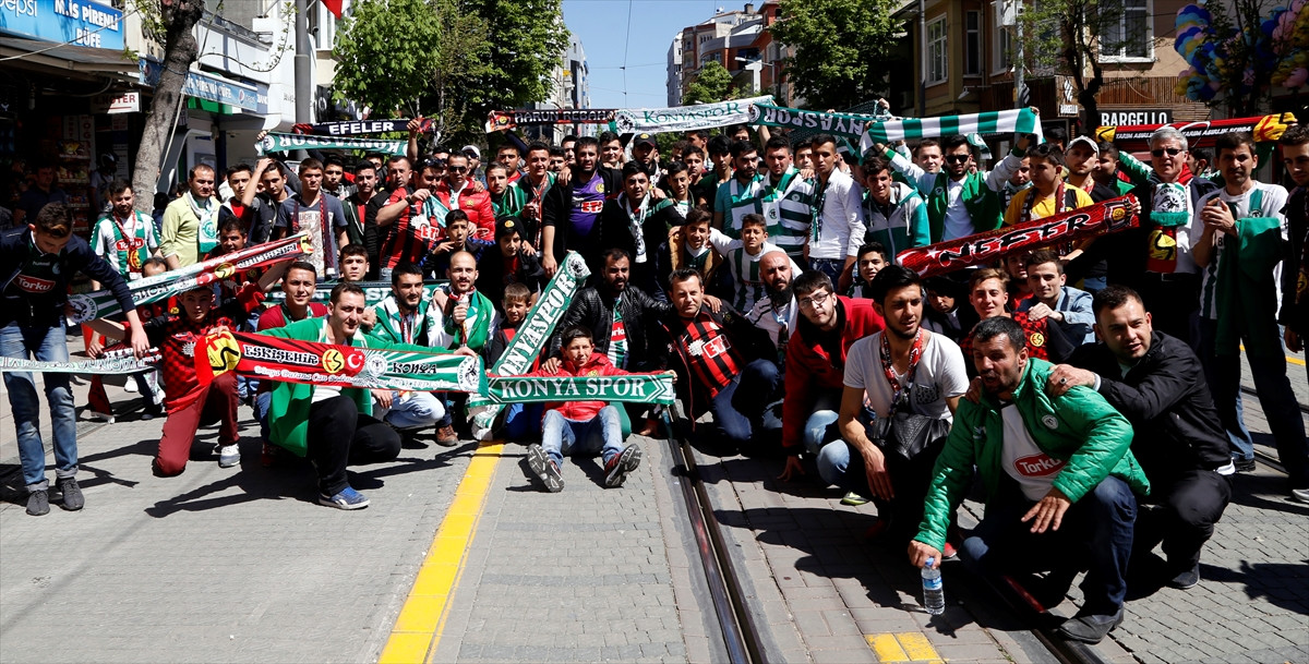 Erken saatlerden itibaren Konya'dan Yüksek Hızlı Tren, otobüs ve özel araçları ile Eskişehir'e gelen konuk takım taraftarları, kent merkezinde Eskişehirsporlu taraftarlarla buluştu.