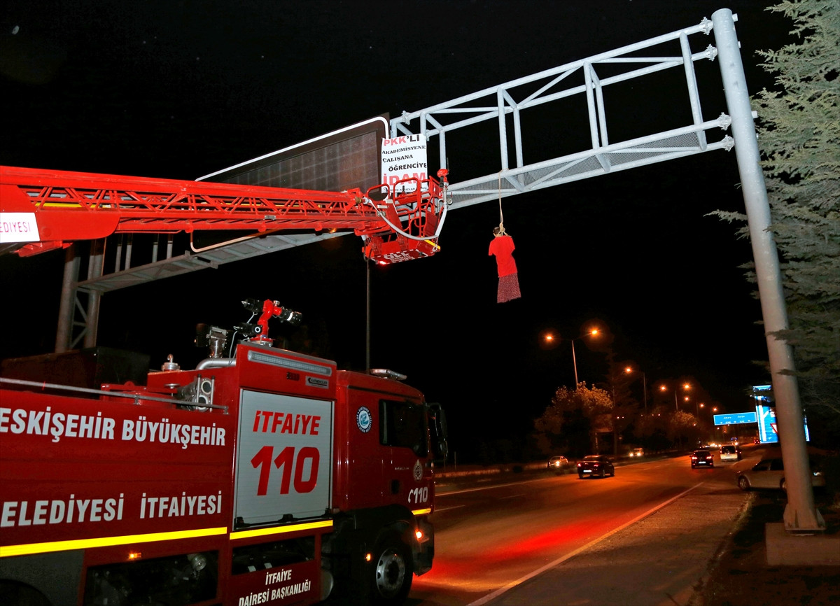 Eskişehir'de, Bursa-Ankara karayolundaki trafik uyarı levhalarına asılan pankart ve cansız mankeni polis ekipleri kaldırdı. Yeni Bağlar Mahallesi'nde bulunan Havacılık Müzesinin yanından geçen karayolu üzerindeki trafik uyarı levhalarına asılı, ''PKK'lı akademisyene, çalışana, öğrenciye idam. Genç Atsızlar, ESOGÜ'' yazılı pankart ile direkte sallanan etek giydirilmiş cansız mankeni gören çevredekiler, durumu polise bildirdi. Olay yerine gelen emniyet ekipleri, çevre güvenliğini aldıktan sonra yaklaşık 5 metre yükseklikte asılı cansız manken ile pankartı kaldırmak için itfaiye ekiplerinden yardım istedi. Cansız manken ve pankart itfaiye ekiplerince kaldırılarak, incelenmek üzere emniyete götürüldü.