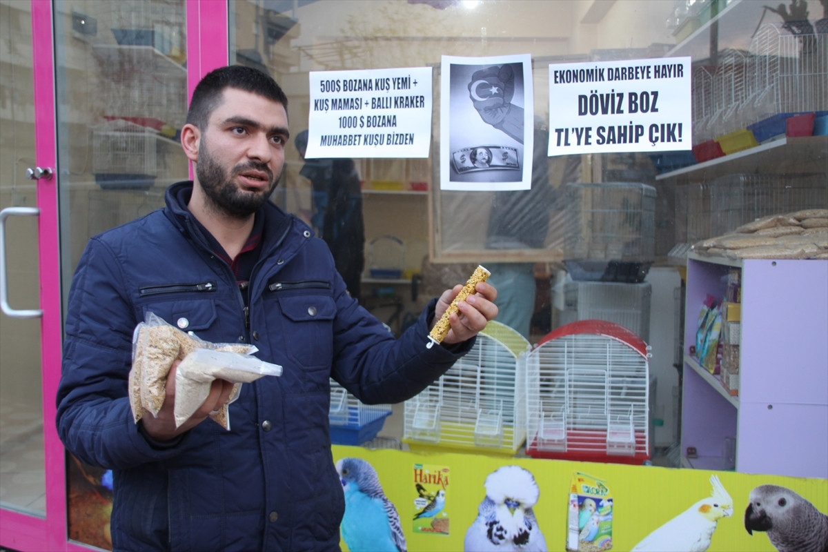 Ülke üzerinde hesap yapan dış güçlerin Türkiye'yi ekonomik krize sokmak istediğini dile getiren Ağah, "Destek için kampanya başlattık. Cumhurbaşkanımız Recep Tayyip Erdoğan'ın çağrısına destek vermek için 500 dolar bozdurana muhabbet kuşu yemi, muhabbet krakeri ve mamasını ücretsiz veriyoruz. Bin dolar bozdurana ise muhabbet kuşu veriyoruz." dedi.