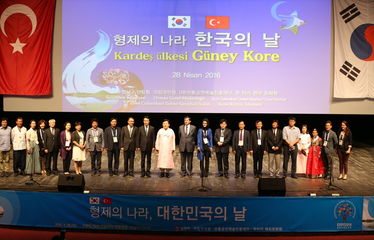 EXPO 2016 Antalya Kongre Merkezi'nde "Kardeş Ülke Güney Kore" sloganıyla düzenlenen etkinliğe, EXPO 2016 Antalya Ajansı Genel Komiseri Büyükelçi Erdoğan Kök, Suncheon Belediye Başkanı Cho Choong-Hoon, protokol üyeleri ve davetliler katıldı.