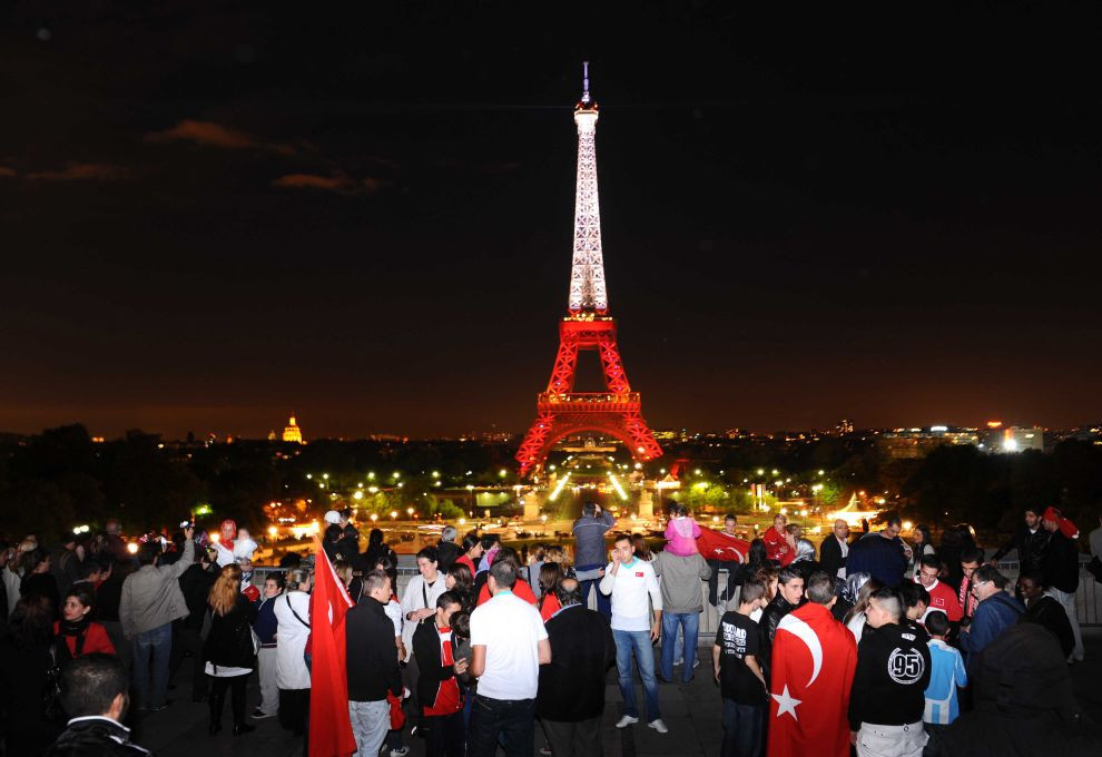 Fransa'nın ev sahipliğinde düzenlenen 15. Avrupa Futbol Şampiyonası kapsamında Eyfel Kulesi bugün Türk bayrağının renklerine bürünebilir. Eyfel Kulesi, turnuva boyunca sosyal medya platformu Twitter'da yürütülen kampanya çerçevesinde, her gün maçı olan ülkeler arasında son maç bitiminden 10 dakika sonra en çok destek alan ülke takımının renkleriyle ışıklandırılıyor. Kule, 15 dakika boyunca seçilen takımın renkleriyle aydınlanıyor. İlk iki günde en yüksek desteği alan ve bugün turnuvadaki ilk maçına çıkacak olan Türk Milli Takımı, bugün de genel sıralamada yüzde 35'le birinciliği büyük bir farkla sürdürüyor. En çok desteği alan ülkeler arasında ikinci sırada yüzde 14 ile İngiltere, üçüncü sırada ise yüzde 12 ile Fransa bulunuyor. Eyfel Kulesi'nin ışıklandırılmasına aday ülkeler arasında bugün TSİ 16.00'da Milli Takım ile karşılaşacak olan Hırvatistan'ın yanı sıra Polonya, Kuzey İrlanda, Almanya ve Ukrayna bulunuyor. İlk gün en çok oyu alan Fransa olurken, ikinci gün de Eyfel Kulesi en çok destek alan Galler'in bayrağının renkleriyle aydınlatıldı. Her maç günü ayrıca kule üzerinde asılı bulunan topa da en çok destek alan ülkenin bayrağı projeksiyonla yansıtılacak. Sporseverler tarafından Twitter'da paylaşılan günün en popüler mesaj ve fotoğrafları Eyfel Kulesi üzerinden görünebilecek.