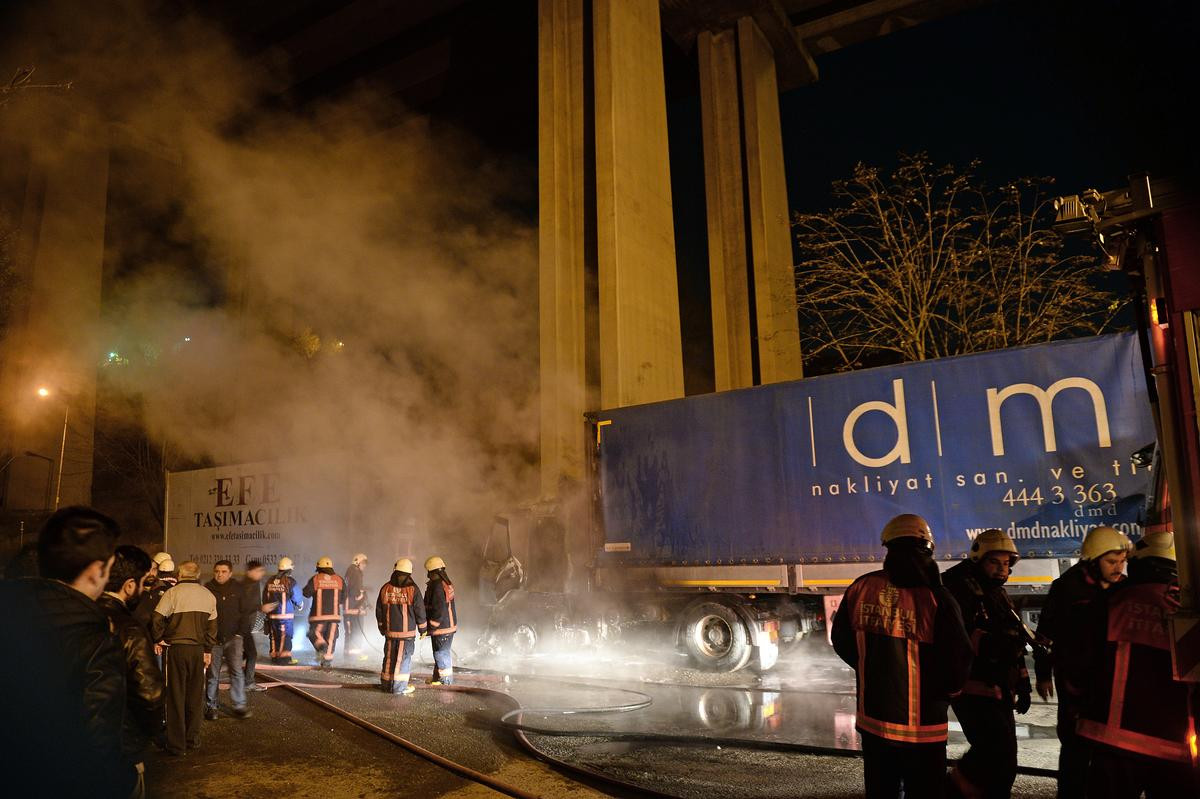 Edinilen bilgiye göre, Güzeltepe Birsen Sokak'ta birbirine yakın park halindeki farklı iki nakliyat firmasına ait 34 YJ 9642 plakalı tır ile 34 DA 5646 plakalı kamyonun kabin kısımlarında bilinmeyen bir nedenden dolayı yangın çıktı.