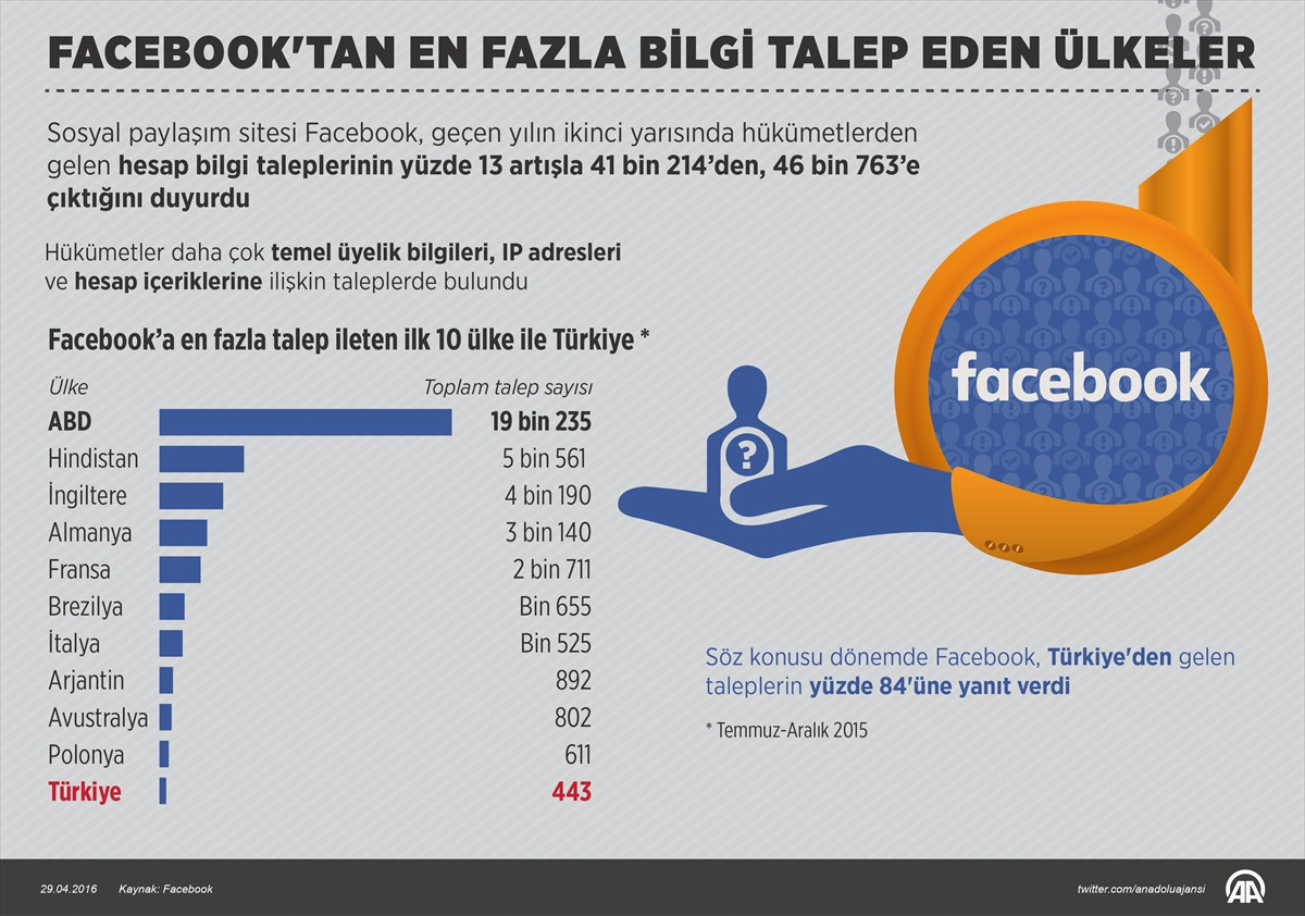 Facebook'tan yapılan açıklamada, 2015 yılının ikinci 6 ayına ait verileri kapsayan Küresel Hükümet Talepleri Raporu’nda (Global Government Requests Report), hükümetlerden gelen hesap bilgi taleplerinin yüzde 13 artışla 41 bin 214’den, 46 bin 763’e çıktığı belirtildi. Raporda, hükümetlerin daha çok temel üyelik bilgileri, IP adresleri ve hesap içeriklerine ilişkin taleplerde bulunduğu kaydedildi.