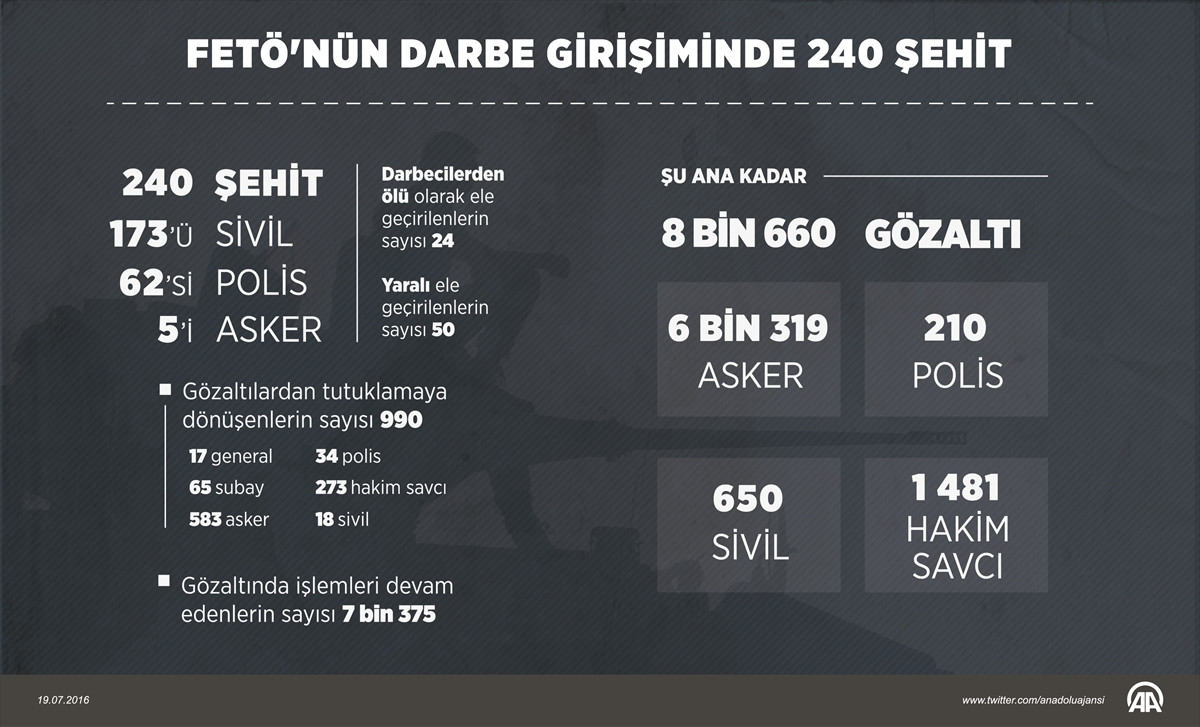 ANKARA (AA) - FETÖ'nün darbe girişimi sonrası 210 emniyet mensubu ile 6 bin 319 asker, bin 481 hakim-savcı ve 650 sivil gözaltına alındı, 990 kişi tutuklandı.