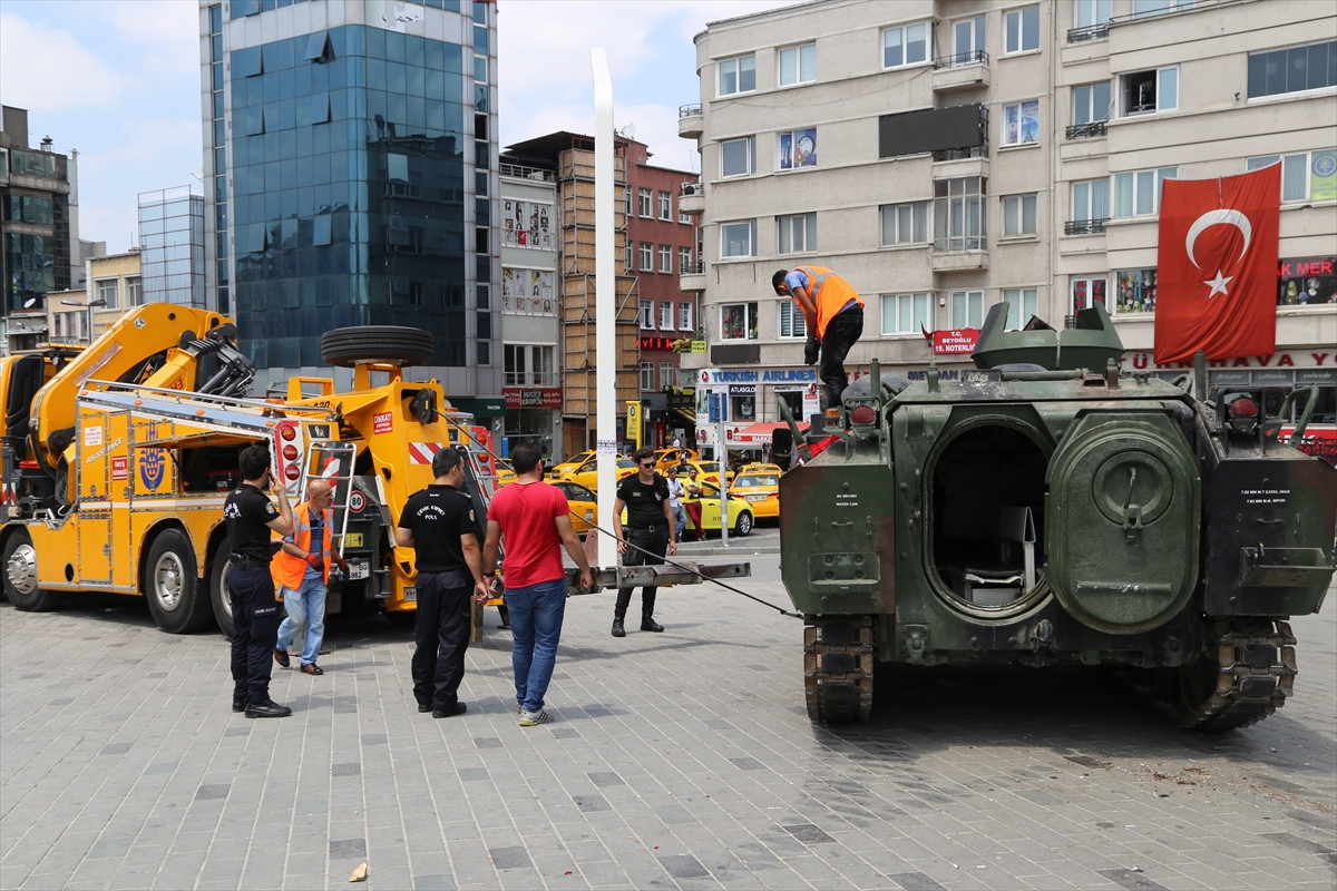 İSTANBUL (AA) - FETÖ'nün darbe girişimi kapsamında önceki gece Taksim Meydanı'na getirilen tank, iş makinesiyle bölgeden çekildi.
