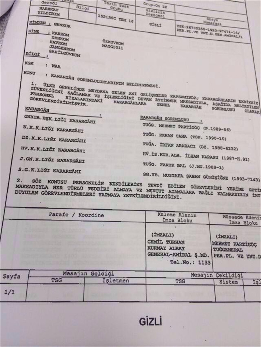 Genelkurmay Başkanlığı Karargahı'nda hazırlanan ve "gizli" ibaresiyle tüm komutanlıklara gönderilen bir mesaj emri ise dikkati çekti.