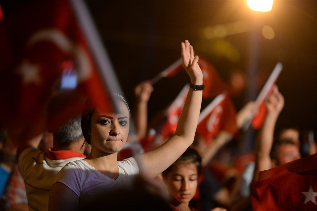 Batmanlı vatandaşlar, FETÖ/PDY üyesi bir grup asker tarafından yapılan darbe girişimine tepki göstermek için ellerinde Türk bayraklarıyla Valilik ve İl Emniyet Müdürlüğü önünde başlatılan nöbet eylemini sürdürüyor.