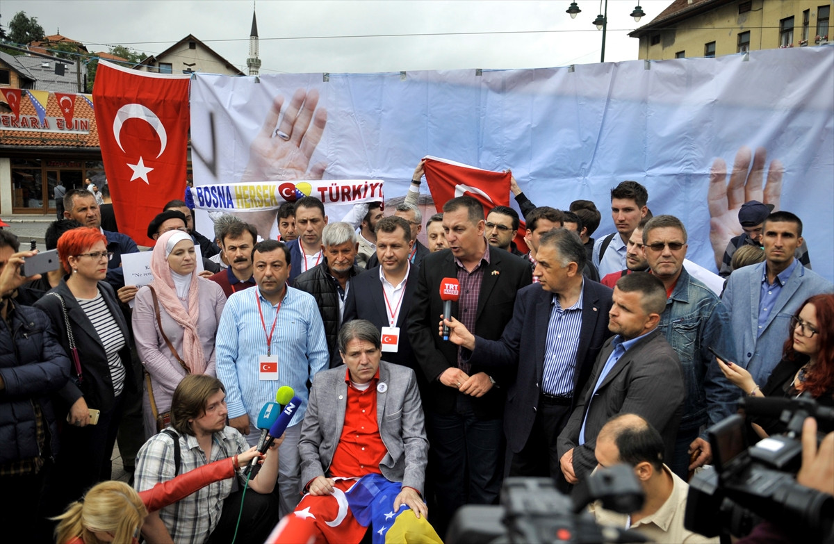 Bosna Hersek'in farklı şehirlerinden gelen yüzlerce kişi, başkentteki Başçarşı Meydanı'nda toplanarak, Türkiye'ye karşı yapılmaya çalışılan darbe girişimini protesto etti.