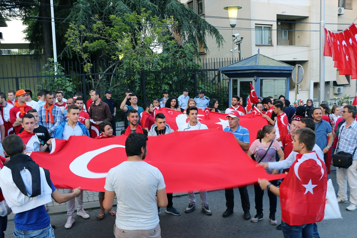 Başkentteki Türkiye'nin Üsküp Büyükelçiliği binası önünde toplanan yüzlerce Makedonyalı Türk, Türkiye'ye karşı yapılmaya çalışılan darbe girişimini protesto etti.