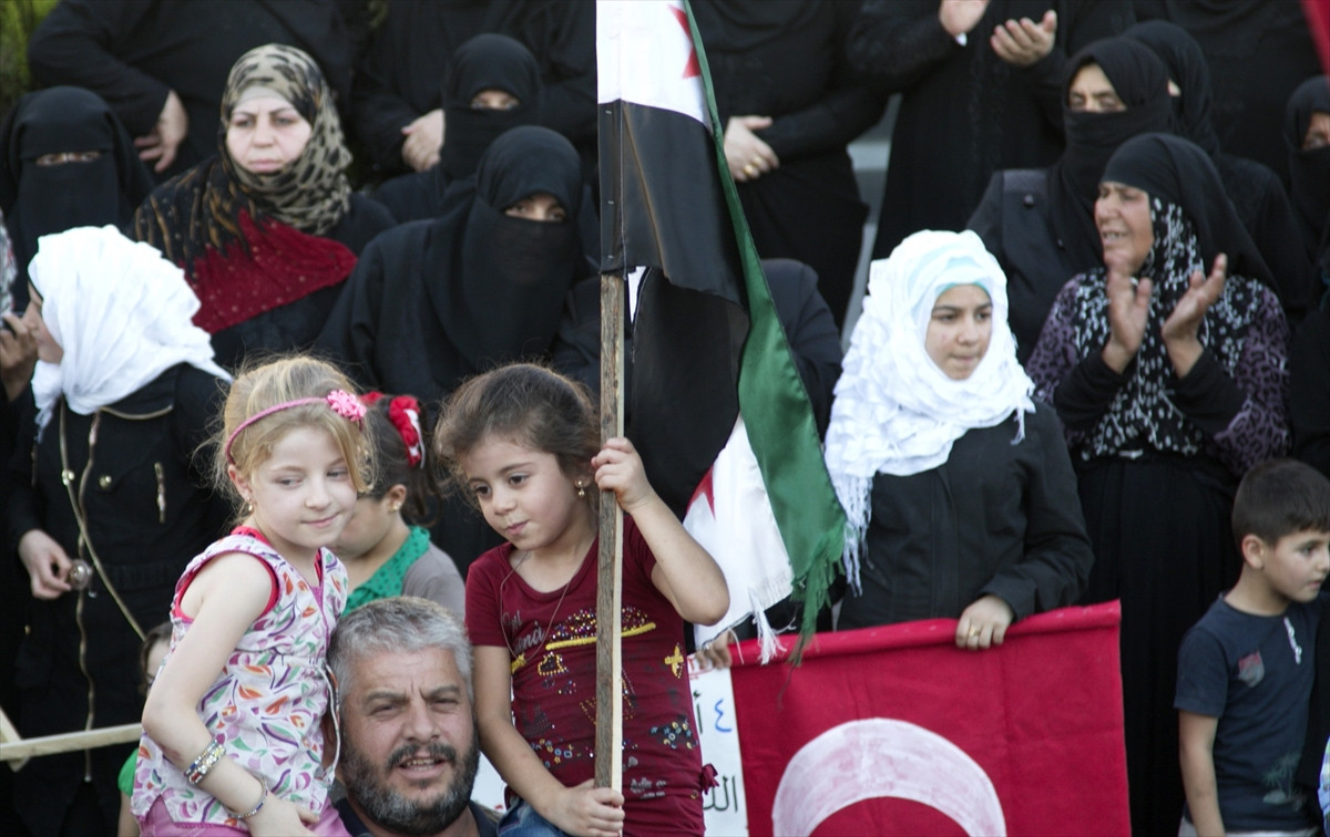 Ülkenin kuzeybatısında yer alan ve rejim güçlerinin her gün saldırılarına maruz kalan İdlib kent merkezinde aralarında kadın ve çocuklarında bulunduğu yüzlerce Suriyeli, ellerine Türk ve Suriye devrim bayrakları alarak bir araya geldi.