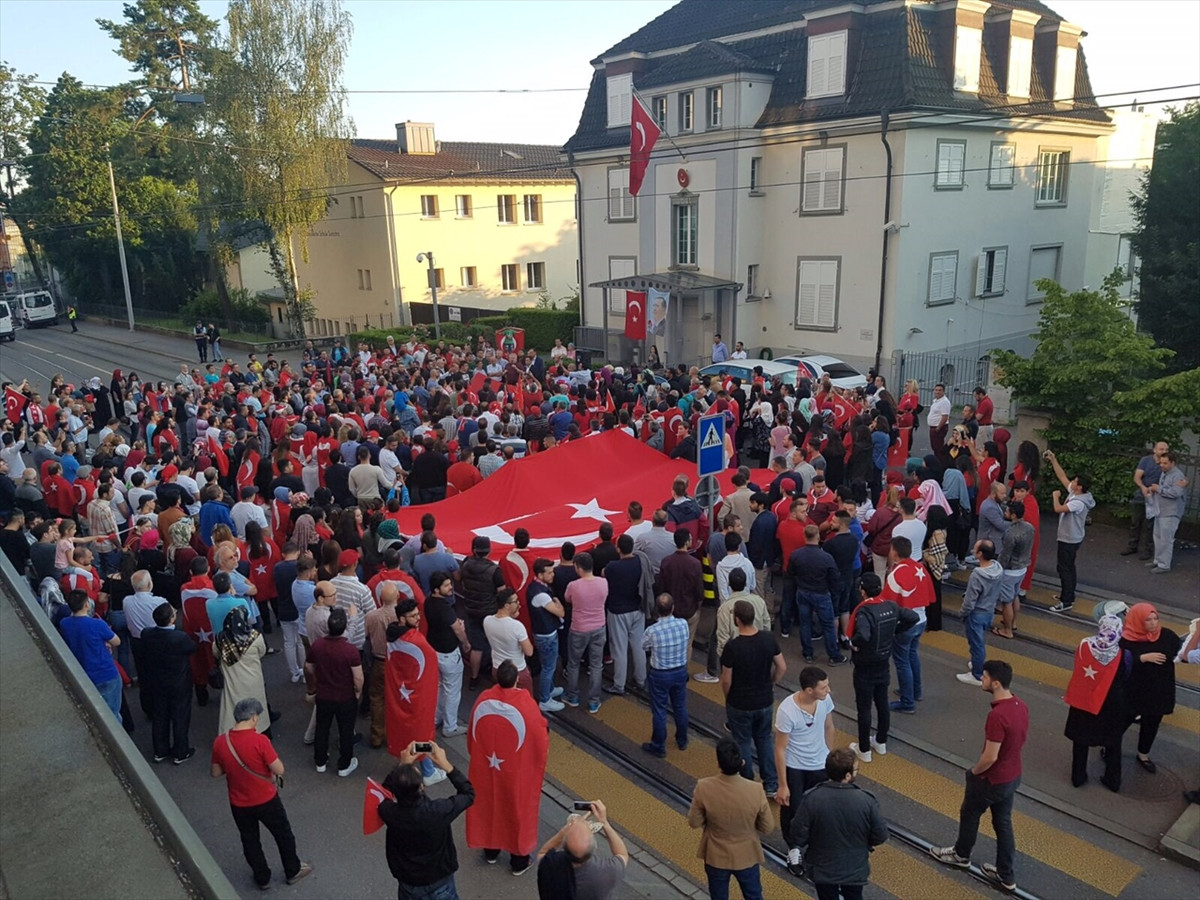 Türkiye'nin Zürih Başkonsolosluğu önünde toplanan yaklaşık 500 Türkiye, Somali, Arnavutluk, Bosna Hersek vatandaşı, darbe girişimini lanetleyerek kınadı.