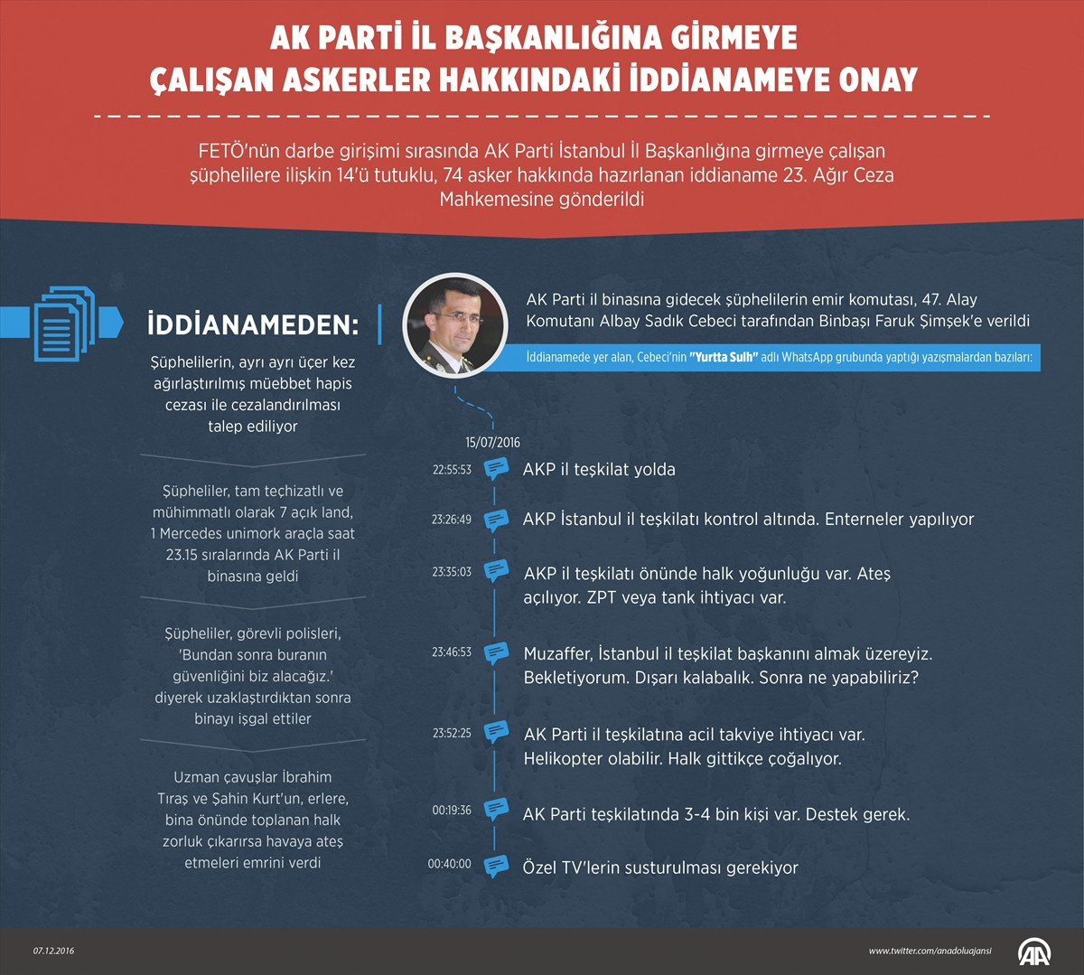 İSTANBUL (AA) - İstanbul Cumhuriyet Başsavcılığınca hazırlanan iddianamede, 14'ü tutuklu 74 asker şüphelinin, Fetullahçı Terör Örgütü'nün (FETÖ) 15 Temmuz darbe girişimi gecesi AK Parti İstanbul İl Başkanlığını işgal hazırlıkları ve o gece yaşananlar anlatıldı.