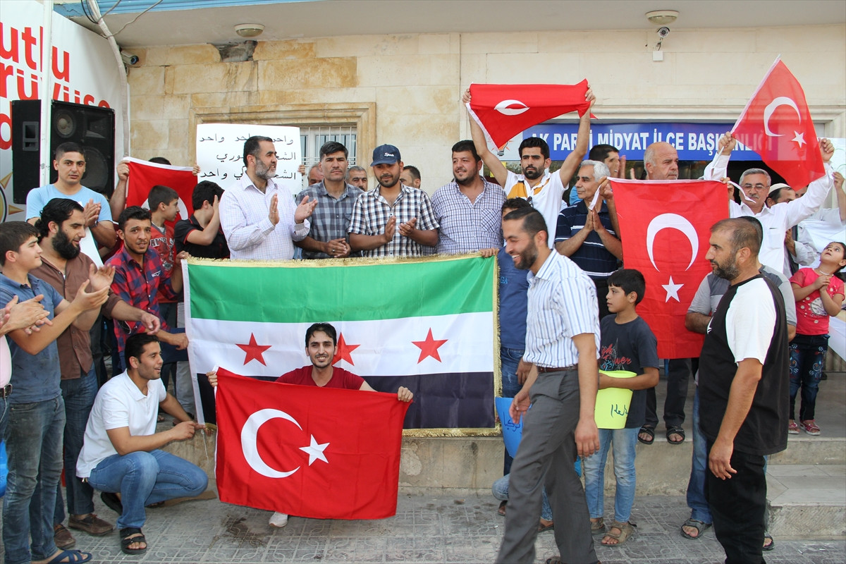MARDİN (AA) - Ülkelerindeki iç savaştan kaçarak Mardin'in Midyat ilçesine yerleşen Suriyeliler, FETÖ'nün darbe girişimini protesto etti.