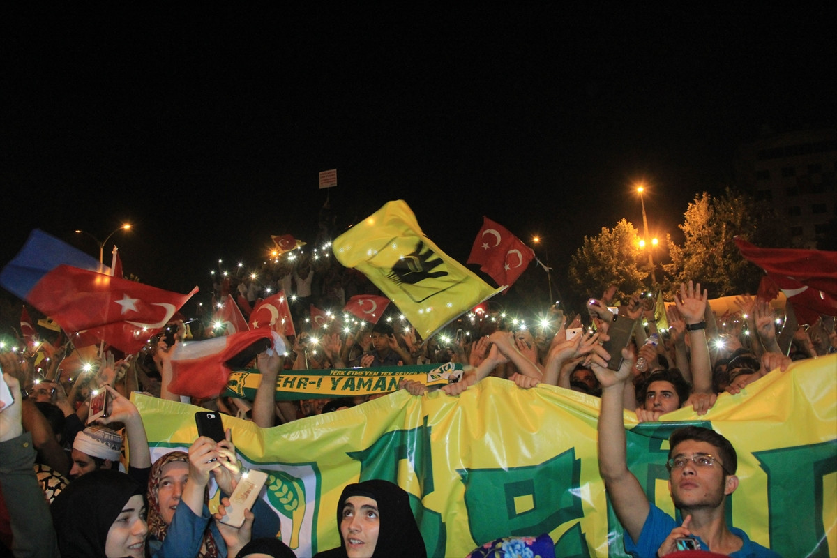 Valilik bahçesinde toplanan yaklaşık 80 bin kişi, cep telefonlarının ışıklarını yakarak, darbe aleyhine tezahüratlarda bulunup, tekbir getirdi. Grup, sık sık Cumhurbaşkanı Recep Tayyip Erdoğan ve Türkiye lehine slogan attı.