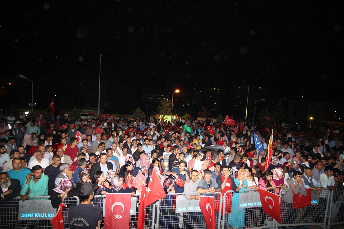 Ağrı'da da binlerce vatandaş FETÖ'nün darbe girişiminin ilk ortaya çıkmasıyla başlattıkları demokrasi nöbetini, üçüncü günün akşamında da sürdürdü.