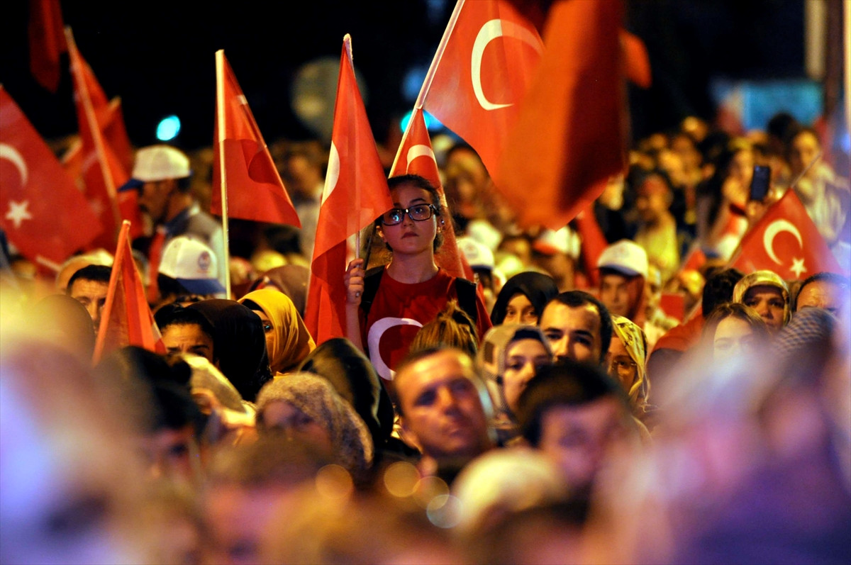 Afyonkarahisar'da vatandaşlar, FETÖ/PDY üyesi bir grup asker tarafından yapılan darbe girişimine tepki göstermek için ellerinde Türk bayraklarıyla Anıtpark'ta toplandı.