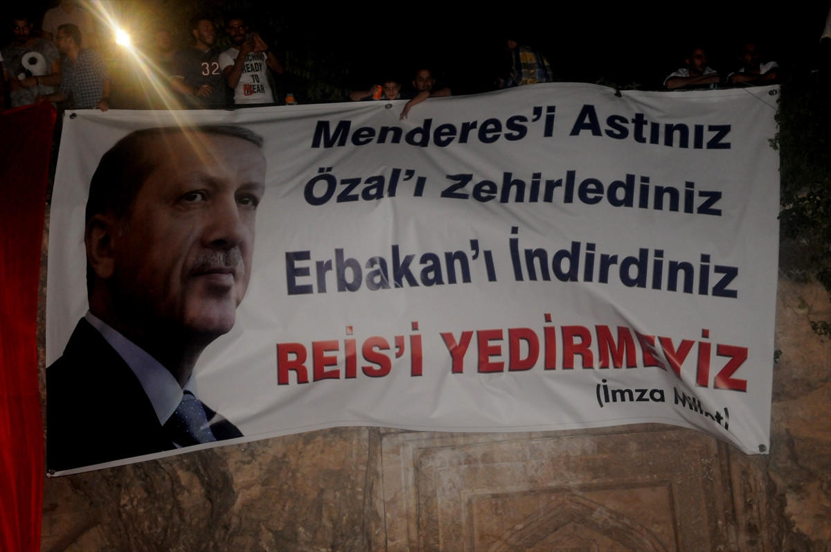 Çevredeki binalara, Cumhurbaşkanı Recep Tayyip Erdoğan'ın dev posteri, büyük Türk bayrağı, FETÖ elebaşı Fethullah Gülen'in fotoğrafı ve "Hain" yazısı bulunan poster, "Reis sen rahat ol, bizler buradayız" yazılı pankart asıldığı görüldü.