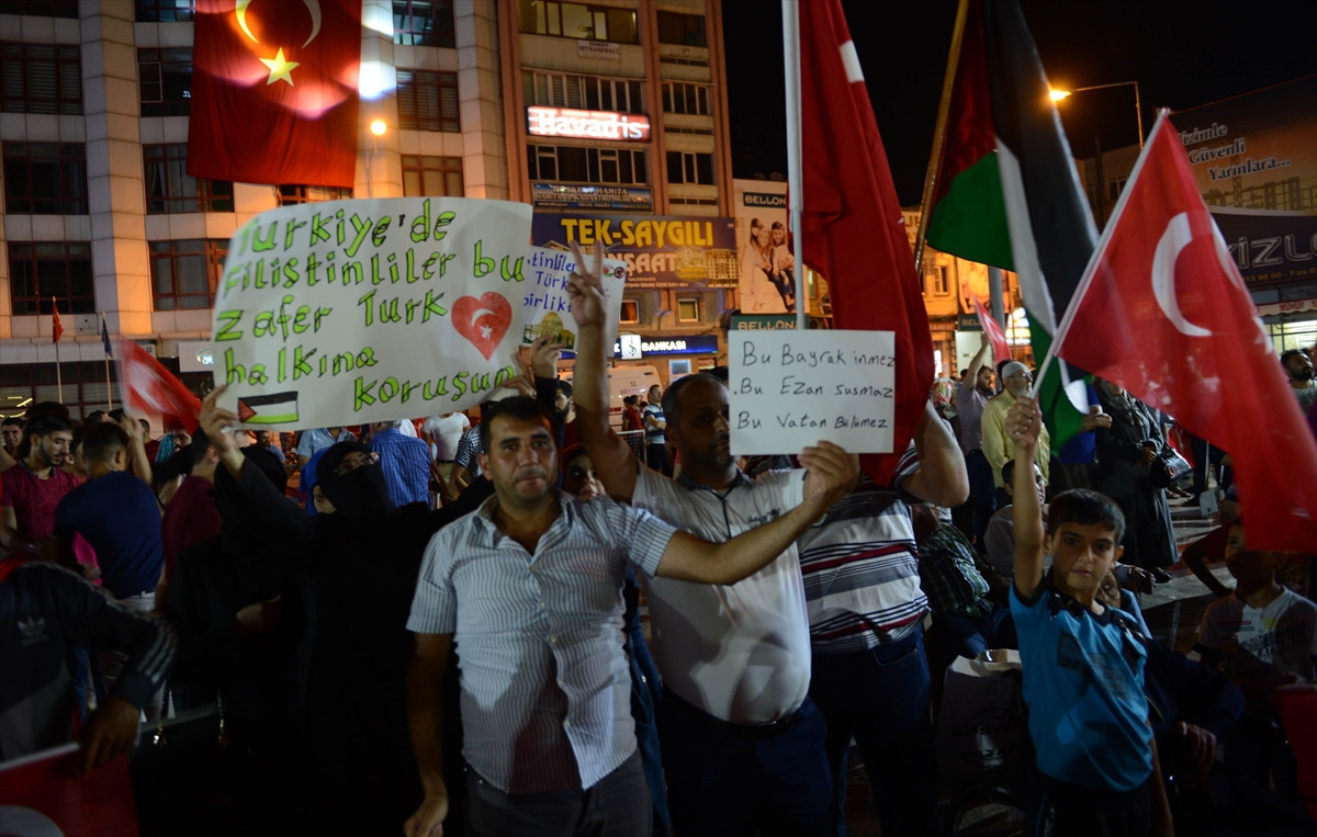 Kilis Valiliği ve Belediyesinin çağrısı üzerine ellerinde Türk ve Filistin bayraklarıyla Cumhuriyet Meydanı'nda toplanan binlerce vatandaş, "Recep Tayyip Erdoğan", "Hainler hesap verecek", "İdam istiyoruz" ve "Kilis burada hainler nerede" sloganları atarak, tekbir getirdi.