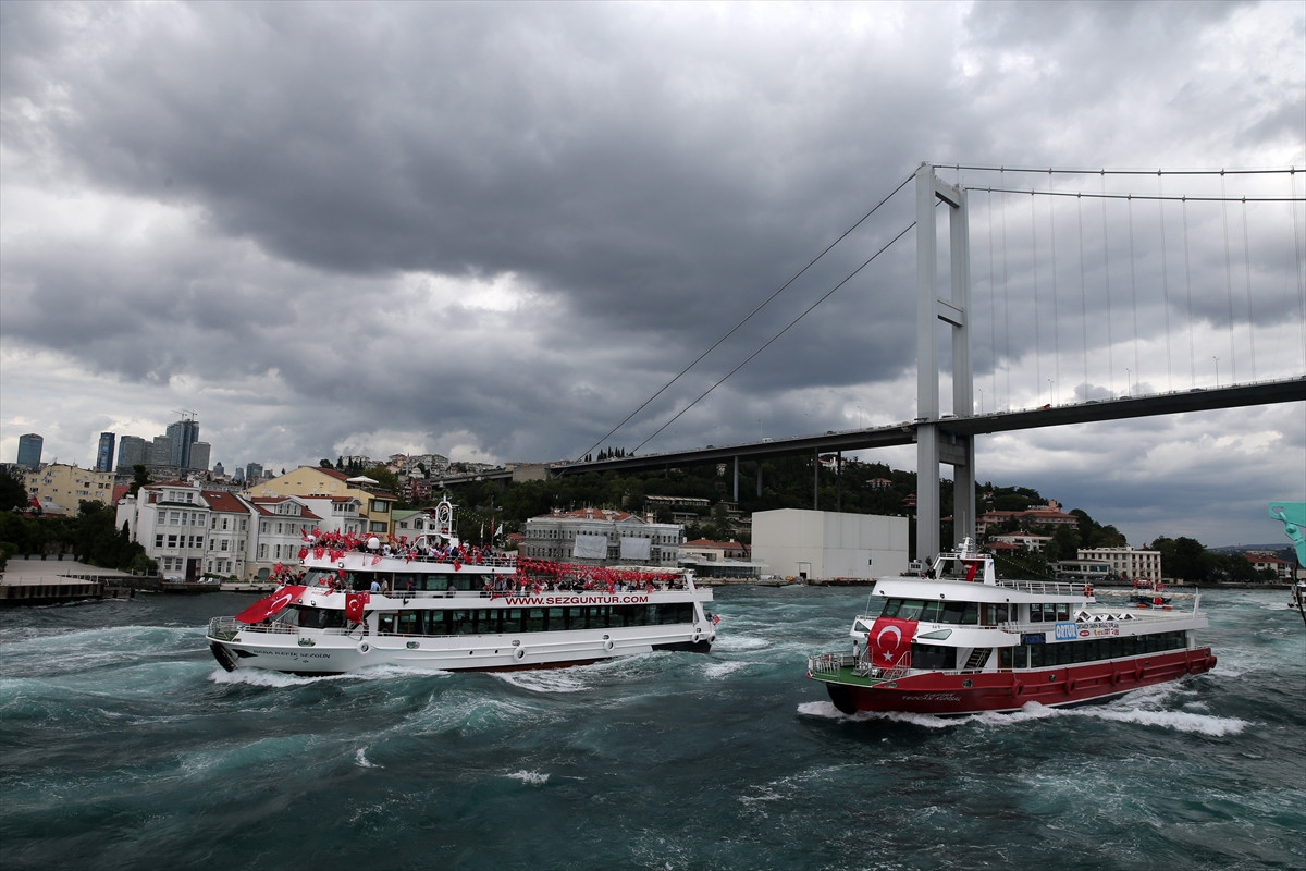 İSTANBUL (AA) - AK Parti Sarıyer İlçe Başkanlığı öncülüğünde bir araya gelen vatandaşlar, yaklaşık 200 balıkçı ve tur teknesiyle İstanbul Boğazı'nda "demokrasi turu"na çıktı.