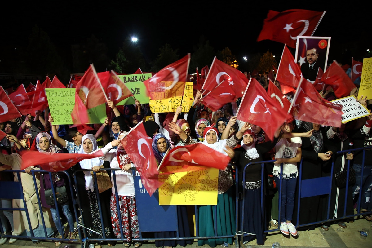Kilis Valiliği ve Belediyesinin çağrısı üzerine ellerinde Türk bayraklarıyla Cumhuriyet Meydanı'nda toplanan binlerce Suriye, Filistin ve Türk vatandaşı, "Recep Tayyip Erdoğan", "Biz buradayız hainler nerede", "İdam istiyoruz" sloganları atarak, tekbir getirdi.