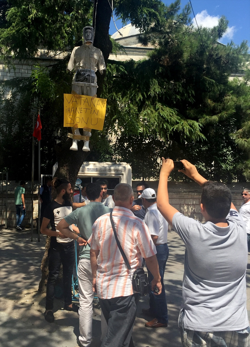 Beyazıt'ta toplanan esnaf, bir vitrin mankenin yüz kısmına Fetullah Gülen'in fotoğrafını koyarak, üzerine "vatana ihanetin sonu" yazdı.