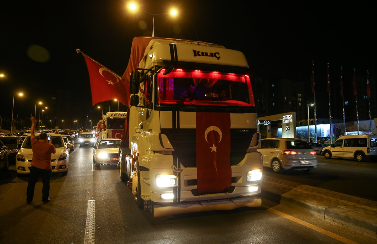 Kamyoncular, darbe girişiminde saldırıya uğrayan noktalar arasında yer alan Cumhurbaşkanlığı Külliyesi, Ankara Emniyet Müdürlüğü, Genelkurmay Başkanlığı ve Kızılay'dan geçerek, bekleyen vatandaşlara korna çalarak destek verdi.