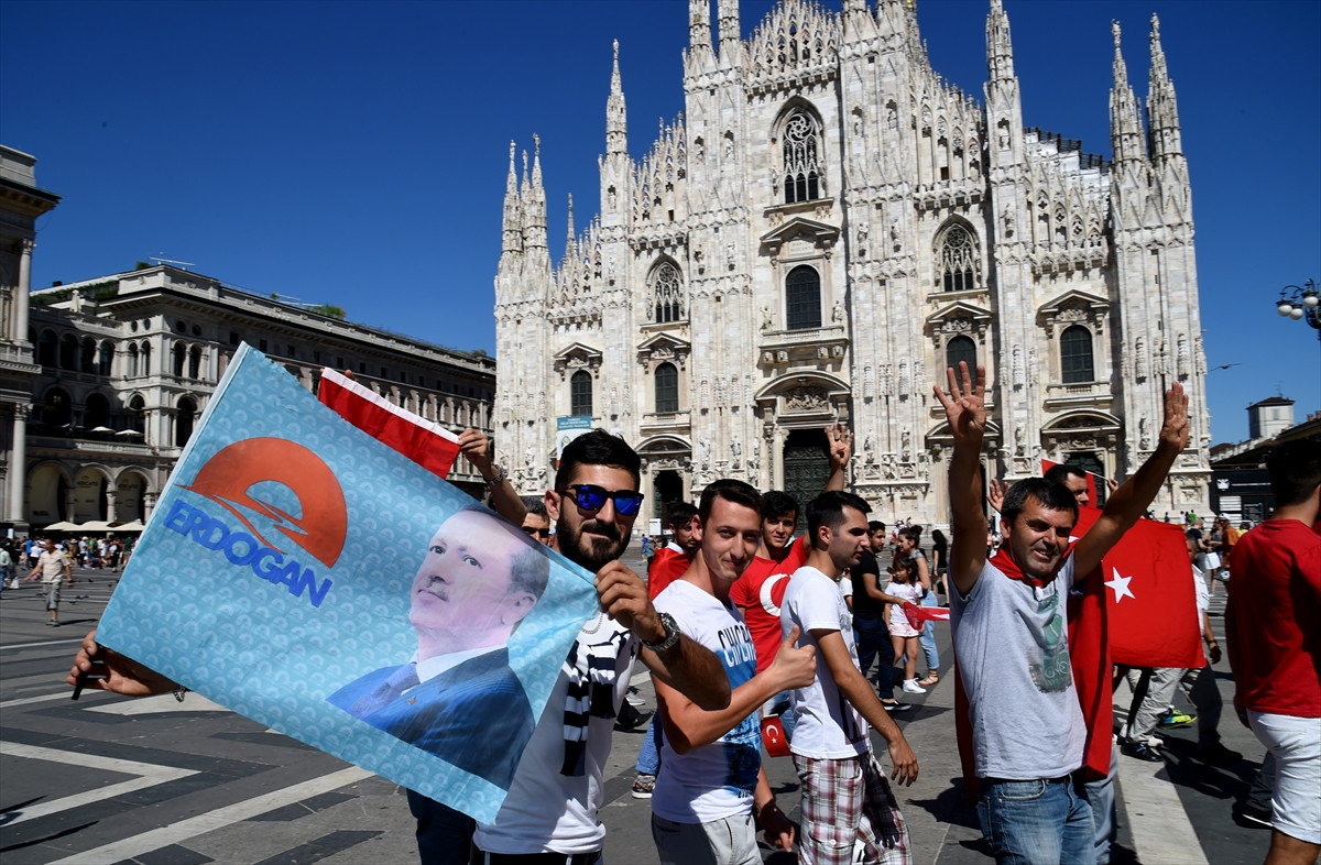 Ülkenin kuzeyindeki Milano’da Türk Başkonsolosluğu önünde toplanan, bu kentin yanı sıra çevre iller Modena, Imperia, Como’dan gelen yaklaşık 200 kadar Türk, FETÖ’nün püskürtülen darbe girişimini protesto etti. Vatandaşlar, alkış ve çeşitli sloganlarla Cumhurbaşkanı Recep Tayyip Erdoğan ve hükümete destek verdi.