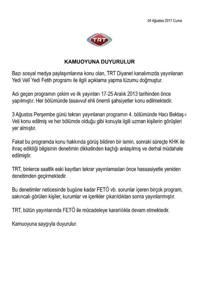 Eski Hitit Üniversitesi Rektör Yardımcısı Osman Eğri konuk olarak izlettirildi. 15 Temmuz darbe girişiminin ardından KHK ile ihraç edildiği belirtilen Osman Eğri’nin eski programına TRT'nin yer verilmesi sosyal medyada tepki çekti. Bunu üzerine TRT’den açıklama geldi.