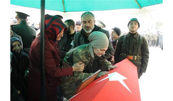 Şehidin, yılbaşı sonrasında evlilik hazırlığı yaptığı nişanlısı Özge Utku da asker kıyafeti giyerek törene katıldı. Tabuta sarılan Özge, nişanlısının fotoğrafını öptü.