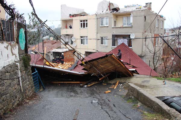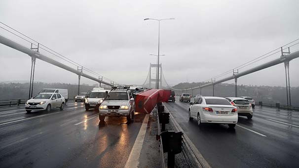 İstanbul'da sabah saatlerinde etkisini artıran şiddetli rüzgar nedeniyle Fatih Sultan Mehmet Köprüsü (FSM) üzerinde, Hasan Akkurt yönetimindeki otomobile bağlı tenteli römork savrularak bariyerlerin üzerine devrildi. Kaza nedeniyle FSM'de Anadolu'dan Avrupa yakasına geçişte trafik yoğunluğu yaşandı. Römork karayolları ekipleri ve trafik polislerinin müdahalesiyle çekiciye yüklenerek yoldan kaldırıldı. Sarıyer’de bir binanın çatısı şiddetli rüzgar nedeniyle başka bir evin bahçesine uçtu. Evlerinin kapısı komşularının çatısıyla kapanan aile içeride mahsur kaldı. Olayda şans eseri yaralanan olmazken, uçan çatının altında bir aracın kaldığı öğrenildi. Olay, Sarıyer’in Fatih Sultan Mehmet Mahallesi’nde bulunan Oltu Sokak üzerinde, sabahın erken saatlerinde meydana geldi. İstanbul’da gece saatlerinden bu yana etkili olan şiddetli rüzgardan etkilenen dört katlı bir binanın çatısı, bulunduğu sokağa ve başka bir evin bahçesine uçtu. İhbar üzerine olay yerine itfaiye ve BEDAŞ ekipleri geldi. Bahçeye uçan çatı evin kapısının kapanmasına neden oldu. Binada mahsur kalanlar evin çatısına çıkarak, itfaiye ekiplerine yaralanmadıklarını, ancak içeride mahsur kaldıklarını iletti. İtfaiye ekipleri çalışmalarına devam ederken, BEDAŞ ekipleri de sokak üzerindeki akımı kesti. Olayı anlatan mahalle sakinlerinden Gülabi Azak, “Sabahın 6’sı gibi oldu. Evdeydik biz, gürültüye kalktık. Altında kimse yoktu, araba kalmış. Daha önce olmadı, hep başka yerlerdekileri görüyorduk” dedi. Başka bir görgü tanığı Muhsin Kurt ise “Binanın çatısı yeni yapılmıştı. Her tarafı açık, cereyan yapınca uçtu çatı” diye konuştu. İtfaiye ekiplerinin olay yerindeki çalışmaları tamamlanırken, uçan çatının kaldırılması için belediye ekipleri bekleniyor.